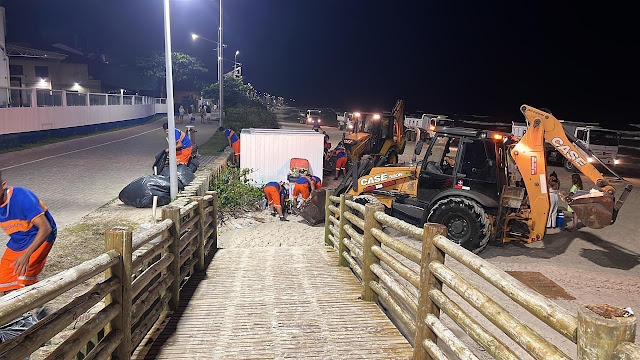 O serviço de coleta acontece sempre à noite, para recolher o volume de lixo orgânico e reciclado das lixeiras, além dos resíduos depositados pela ação da maré, que é realizado com a máquina saneadora, que atua retirando pequenos resíduos da areia, como lixo plástico e objetos cortantes, além de eliminar microrganismos.
